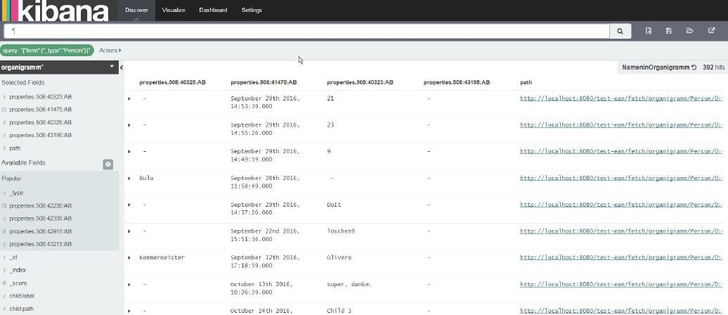 On the left side select you index pattern and add the fields "_type", and everything starting with "properties."(Button "add").